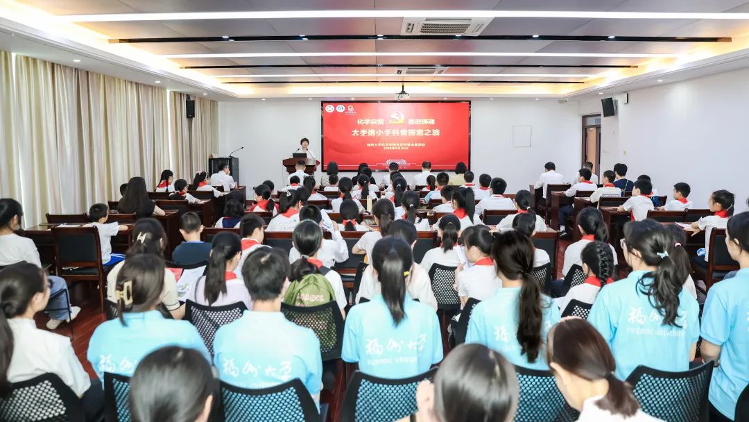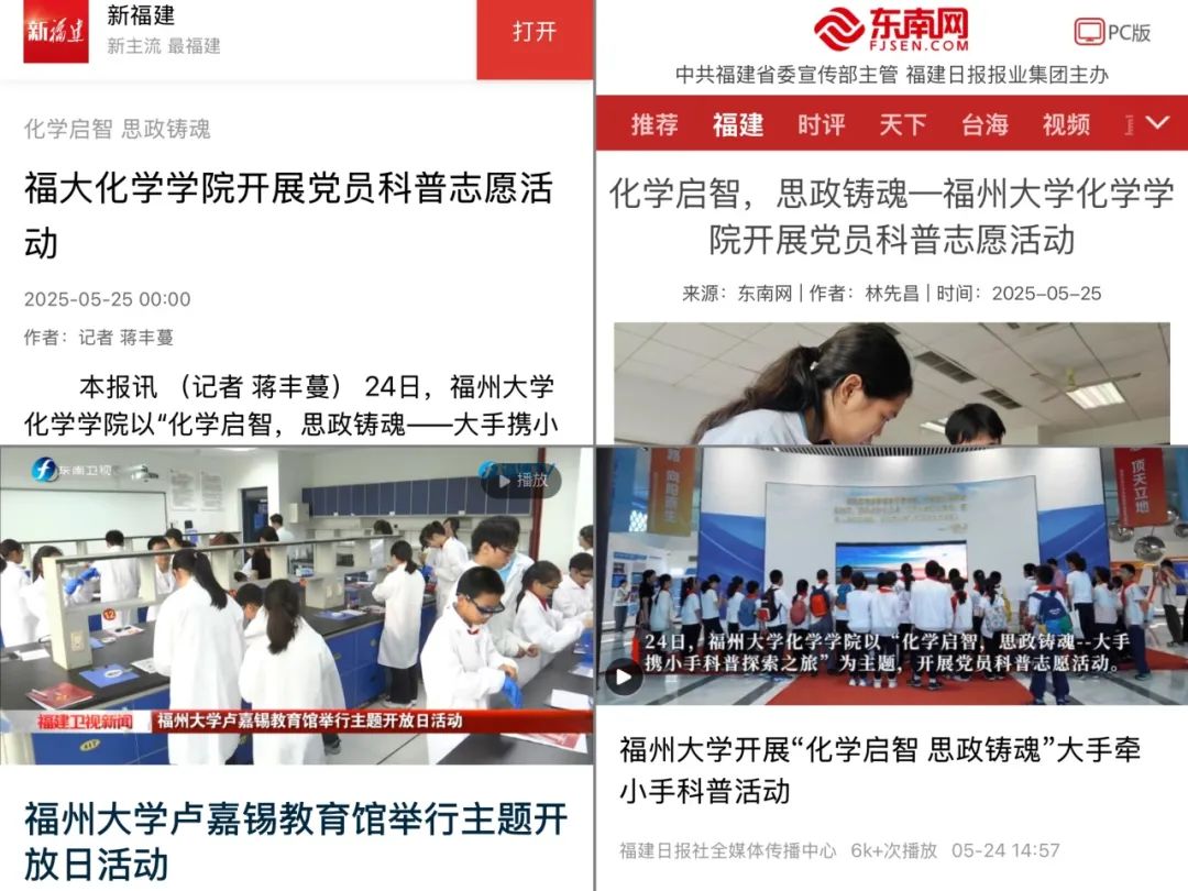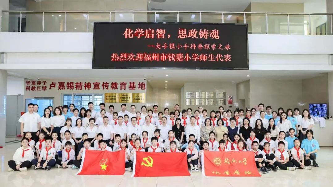 为积极探索党建与育人深度融合的新路径,致力于推动科学知识的普及和传播,发挥学科优势,5月24日,福州大学化学学院以“化学启智,思政铸魂——大手携小手科普探索之旅”为主题,开展党员科普志愿活动,来自福州市钱塘小学的50多名学生走进大学校园,开启了一场充满趣味与知识的科学探索之旅。活动得到福建日报、东南网、福建卫视新闻等多家主流媒体的报道。