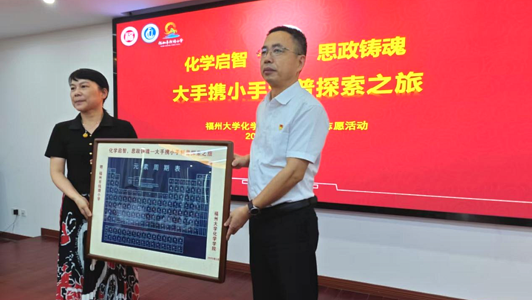 赠礼仪式上,学院党委书记曾忠毅向钱塘小学赠送党员志愿者亲手制作的蓝晒元素周期表纪念品。这份融合科学美学与匠心工艺的礼物,既是对孩子们探索科学的鼓励,又是对“知行合一”党员精神的生动诠释。它不仅承载着科学知识,更象征着科学精神的传递。